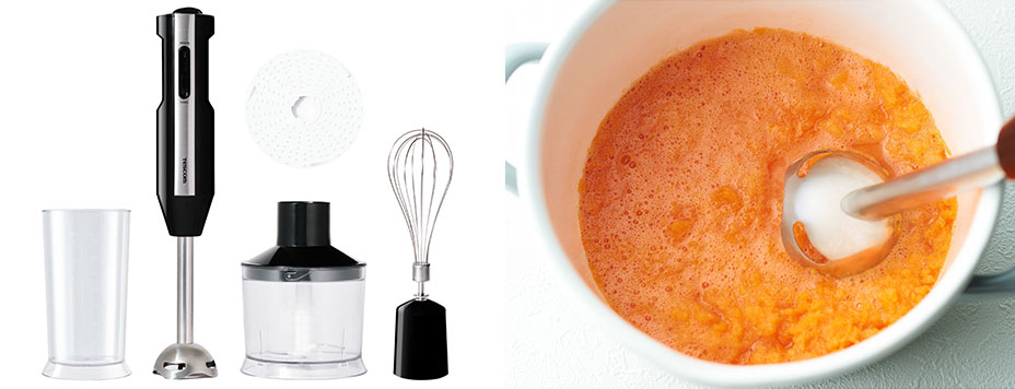 - 効率よく材料をつぶす4枚刃は、鍋に直接入れられるのでスープ作りも手軽にできます。金属製なので臭いや色移りなく清潔に使えます。