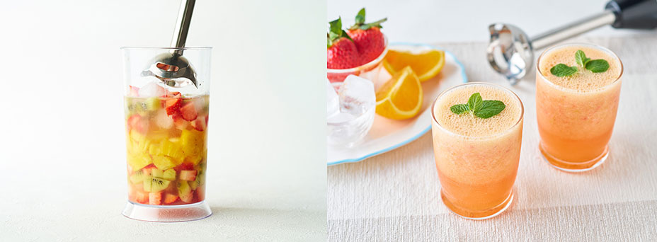 - ブレンダーなら、冷凍果実を使って季節を問わずいちごやマンゴー、ブルーベリーなどの濃厚なドリンクやデザートが簡単に作れます。牛乳やヨーグルト、ジュースなど少量の液体を加えるだけで、素材の冷たさと甘みをいかしたコクのある一杯に。冷凍果実は、冷凍庫に常備しておけば必要な分だけ取り出して使えるので、思い立ったときにいつでも楽しめます。