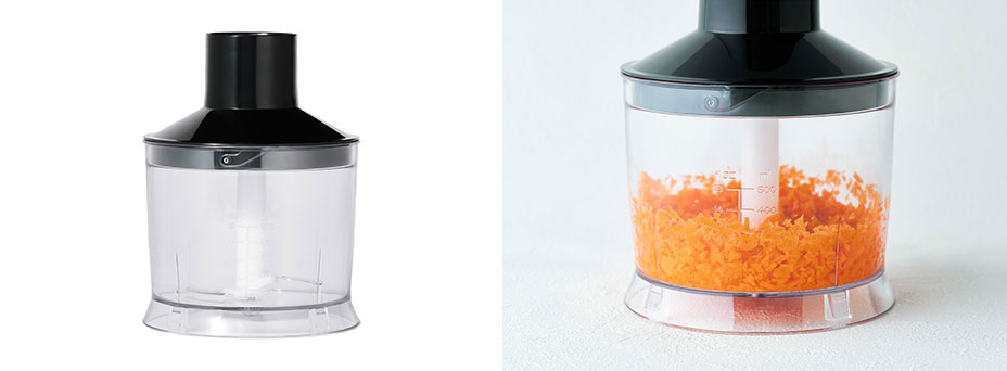 - チョッパーなら、手間のかかるみじん切りもあっという間に均一に仕上がります。専用ボトルに材料を入れて、そのまますばやく処理できます。