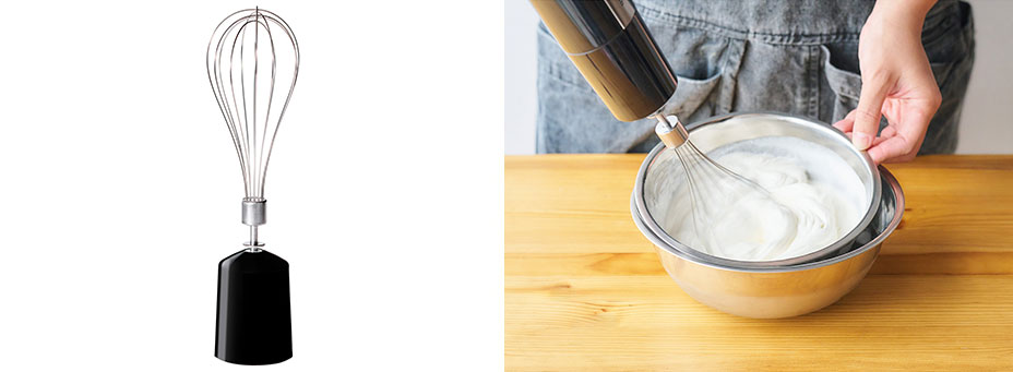 - ビーターで生クリームのホイップもスピーディーに。メレンゲ作りもでき、お菓子作りの幅が広がります。