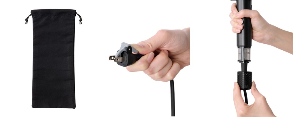- 出し入れが簡単な巾着型ポーチ付きで、コードもすっきり収納できます。バッグの中で散らからず、持ち運びにも便利です。