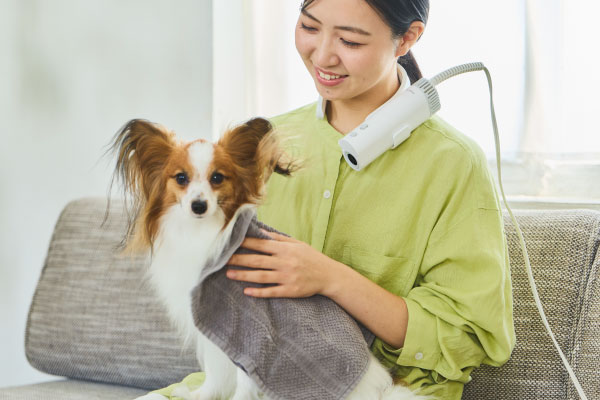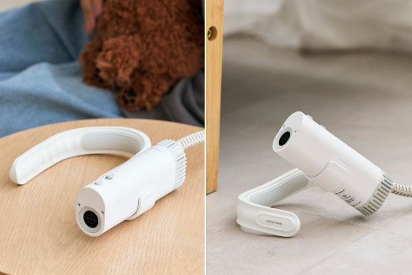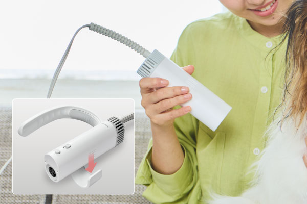 シャンプー後のドライをストレスフリーに!首や肩にかけられるフレキシブルホルダーで両手が自由に使え、ドライ時間がぐっと快適になるペット用ドライヤー「HUG AIR(ハグエアー)」です。愛犬・愛猫を抱きながら乾かせるハンズフリー、お腹周りを下から乾かせるスタンド、細かい部分に使えるハンディーと、シーンに合わせて選べる3WAYスタイル。安心感を与えつつ、効率的に乾かせます。