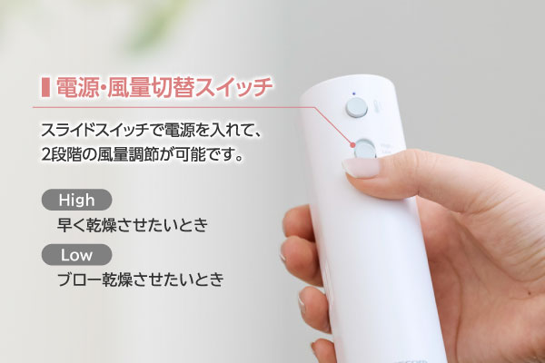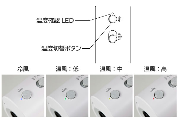 | スイッチ | 温度切り替えスイッチ:冷風/温風(低/中/高)、スライドスイッチ:HIGH/LOW/OFF |