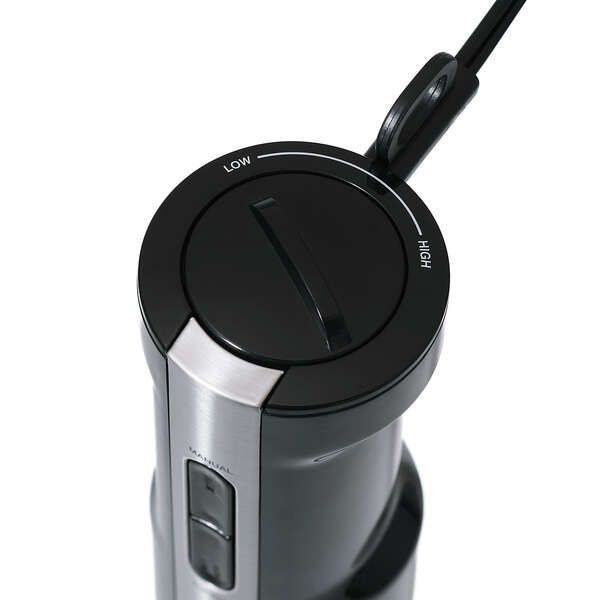 食材の状態や仕上がりの好みに合わせて速度を調整することで、狙いの食感に。高速でブレンドすると細かくなめらかに、低速では砕き過ぎを防いで粗めに仕上げ、風味と食感を保てます。本体上面のつまみを回して、好みの速度を無段階に調整できます。