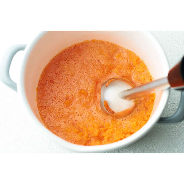 効率よく材料をつぶす4枚刃は、鍋に直接入れられるのでスープ作りもお手軽に。金属製なので臭いや色移りなく清潔に使えます。