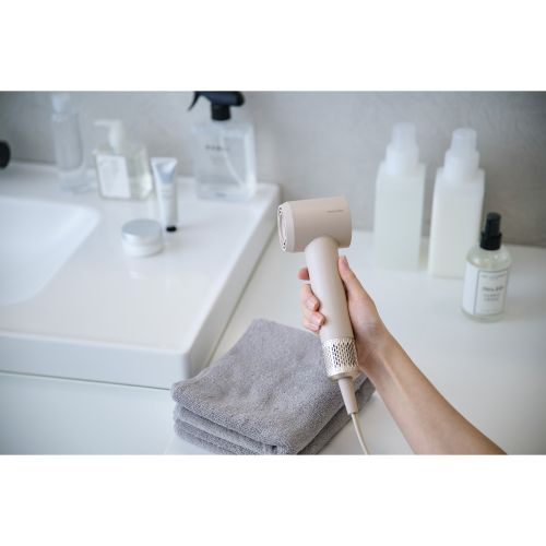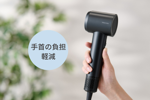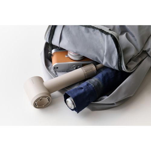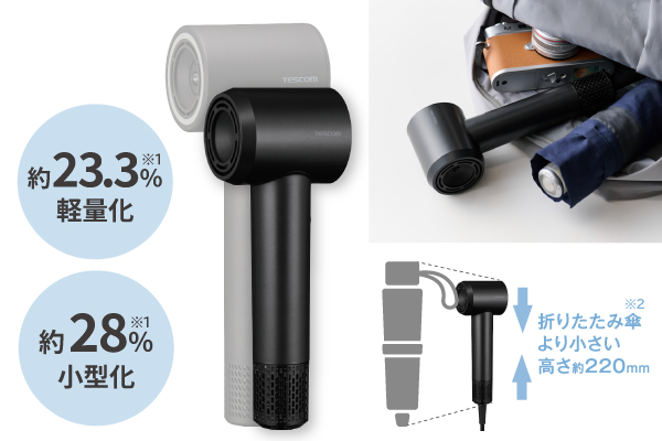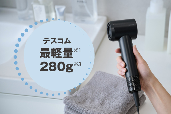 驚くほどの軽さで持ち運びも手軽に。本体質量約280g(※1)で、平均的な折りたたみ傘(※2)よりもコンパクトなI字型ヘアドライヤーです。グリップ内蔵のモーターで重心バランスが良く、手首への負担を軽減。コンパクトながらパワフルな風で、髪の根元からすばやく乾かせます。 ※1:電源コードを除く本体質量 ※2:標準的な3段タイプの折りたたみ傘相当